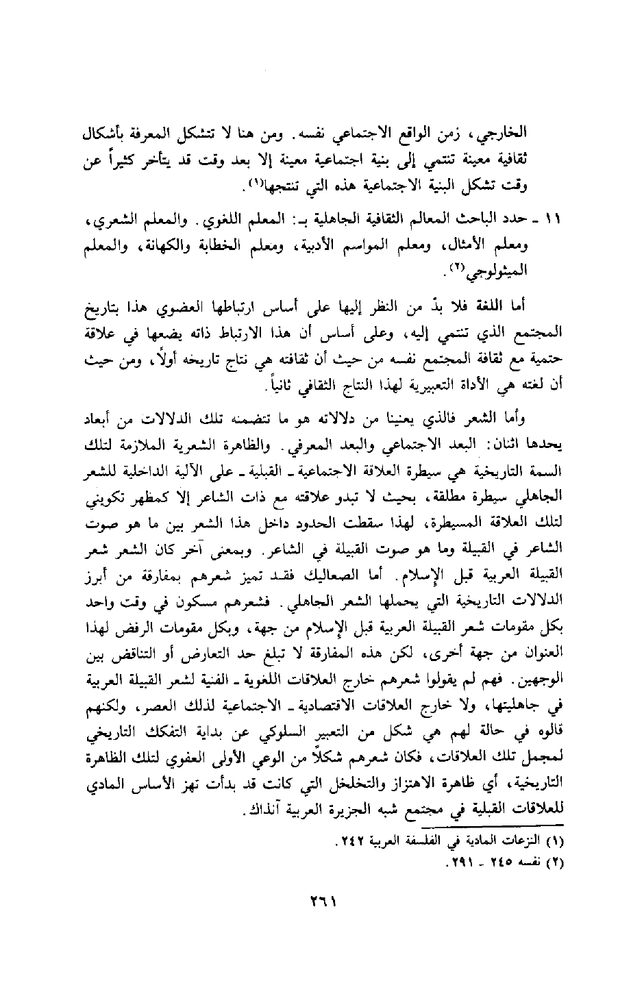 أما اللغة: فلا بُدَّ من النظر إليها على أساس ارتباطها العضوي هذا بتاريخ المجتمع الذي تنتمي إليه، وعلى أساس أن هذا الارتباط ذاته يضعها في علاقة حتمية مع ثقافية المجتمع نفسه؛ من حيث أن ثقافته هي نتاج تاريخه أولًا، ومن حيث أن لغته هي الأداة التعبيرية لهذا النتاج الثقافي ثانيًا.