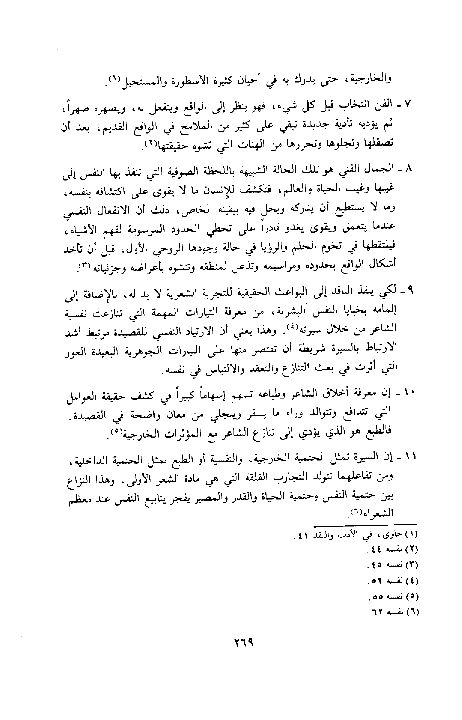 10- إن معرفة أخلاق الشاعر وطبعه تسهم إسهامًا كبيرًا في كشف حقيقة العوامل التي تتدافع وتتوالد وراء ما يسفر وينجلي من معانٍ واضحة في القصيدة, فالطبع هو الذي يؤدي إلى تنازع الشاعر مع المؤثرات الخارجية5.