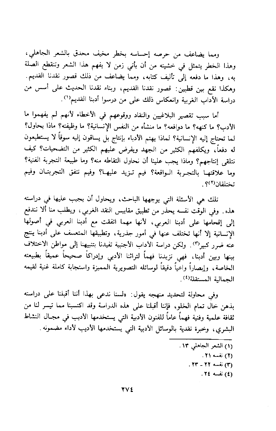 ومما يضاعف من حرصه إحساسه بخطر مخيف محدق بالشعر الجاهلي، وهذا الخطر يتمثّل في خشيته من أن يأتي زمن لا يفهم هذا الشعر وتنقطع الصلة به، وهذا ما دفعه إلى تأليف كتابه، ومما يضاعف من ذلك قصور نقدنا القديم, هكذا نقع بين قطبين: قصور نقدنا القديم، وبناء نقدنا الحديث على أسس من دراسة الآداب الغربية, وانعكاس ذلك على من درسوا أدبنا القديم1.