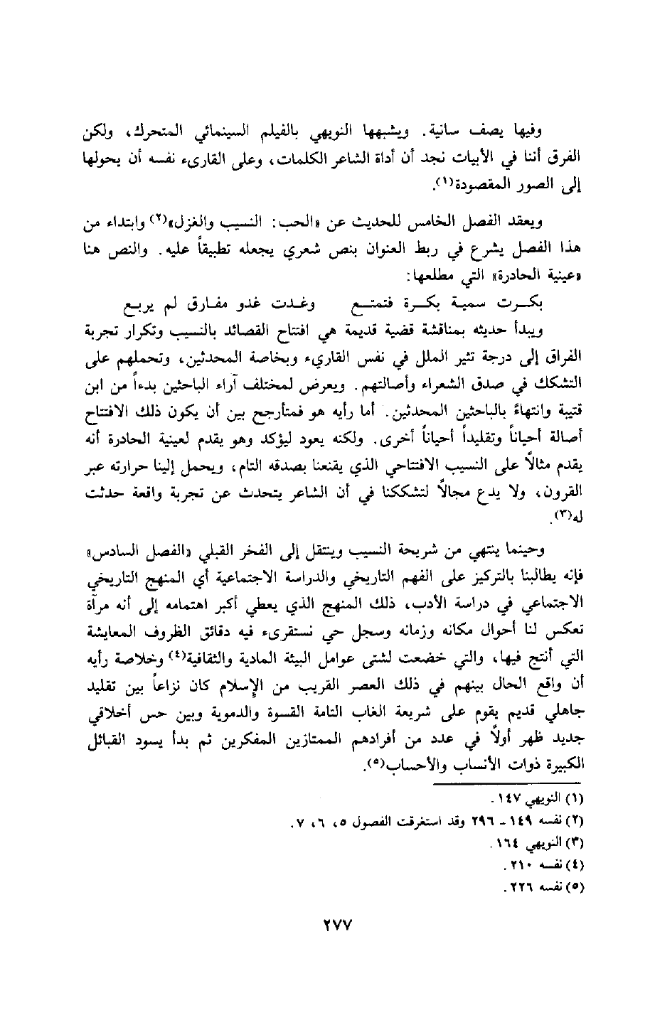 وحينما ينتهي من شريحة النسيب وينتقل إلى الفخر القبلي "الفصل السادس", فإنه يطالبنا بالتركيز على الفهم التاريخي والدراسة الاجتماعية, أي: المنهج التاريخي الاجتماعي في دراسة الأدب، ذلك المنهج الذي يعطي أكبر اهتمامه إلى أنه مرآة تعكس لنا أحوال مكانه وزمانه, وسِجِلُّ حيُّ نستقرئ فيه دقائق الظروف المعايشة التي أنتج فيها، والتي خضعت لشتى عوامل البيئة المادية والثقافية4, وخلاصة رأيه: إن واقع الحال بينهم في ذلك العصر القريب من الإسلام كان نزاعًا بين تقليد جاهلي قديم يقوم على شريعة الغاب التامة القسوة والدموية, وبين حس أخلاقي جديد ظهر أولًا في عدد من أفرادهم الممتازين المفكرين, ثم بدأ يسود القبائل الكبيرة ذوات الأنساب والأحساب5.