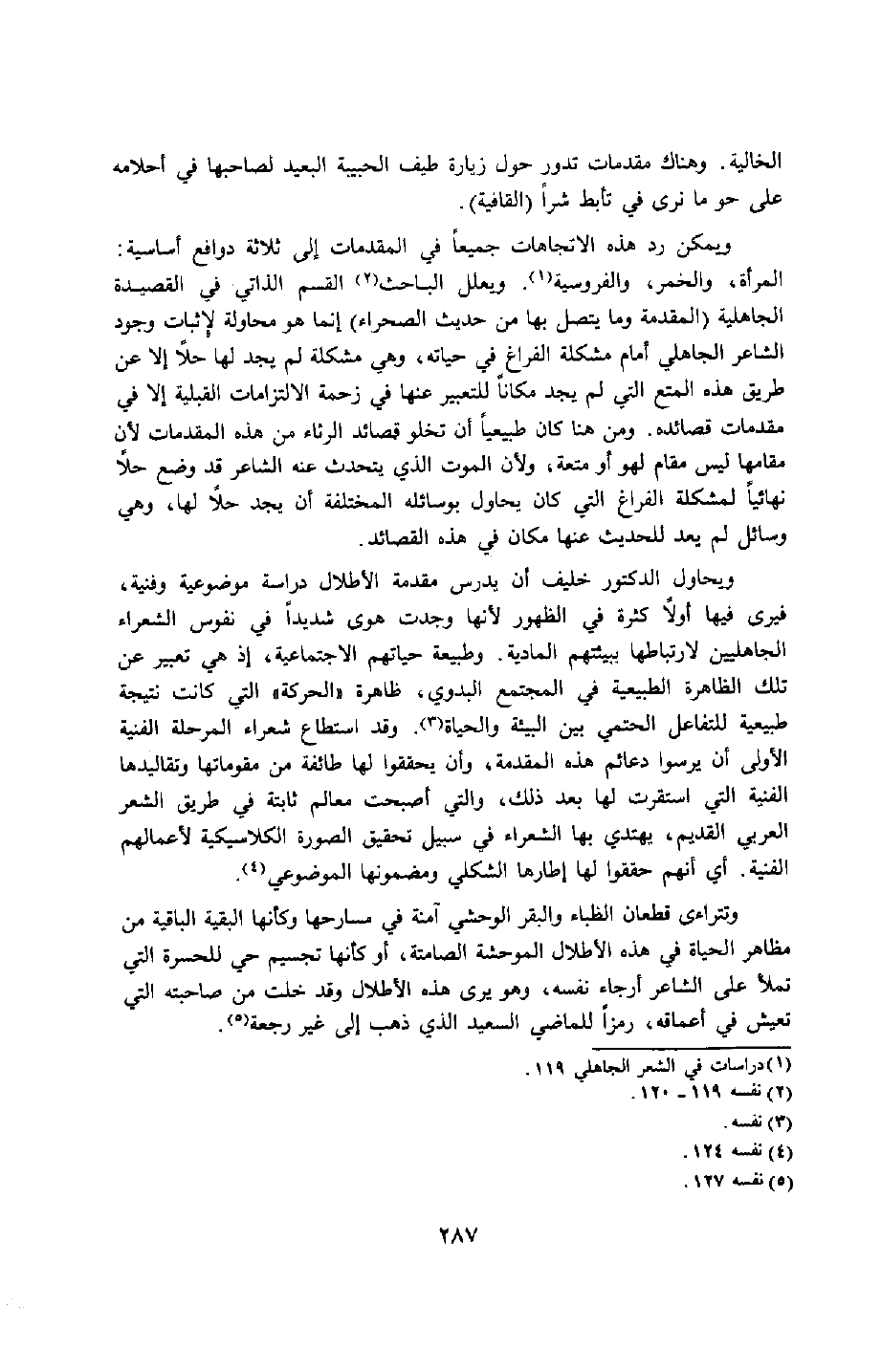 ويحاول الدكتور خليف أن يدرس مقدمة الأطلال دراسة موضوعية وفنية، فيرى فيها أولًا كثرة في الظهور؛ لأنها وجدت هوى شديدًا في نفوس الشعراء الجاهليين لارتباطها ببيئتهم المادية, وطبيعة حياتهم الاجتماعية؛ إذ هي تعبير عن تلك الظاهرة الطبيعية في المجتمع البدوي، وظاهرة "الحركة" التي كانت نتيجة طبيعية للتفاعل الحتميّ بين البيئة والحياة3, وقد استطاع شعراء المرحلة الفنية الأولى أن يرسوا دعائم هذه المقدمة، وأن يحققوا لها طائفة من مقوماتها وتقاليدها الفنية التي استقرت لها بعد ذلك، والتي أصبحت معالم ثابتة في طريق الشعر العربي القديم، ويهتدي بها الشعراء في سبيل تحقيق الصورة الكلاسيكية لأعمالهم الفنية, أي: إنهم حقَّقوا لها إطارها الشكلي ومضمونها الموضوعي4.