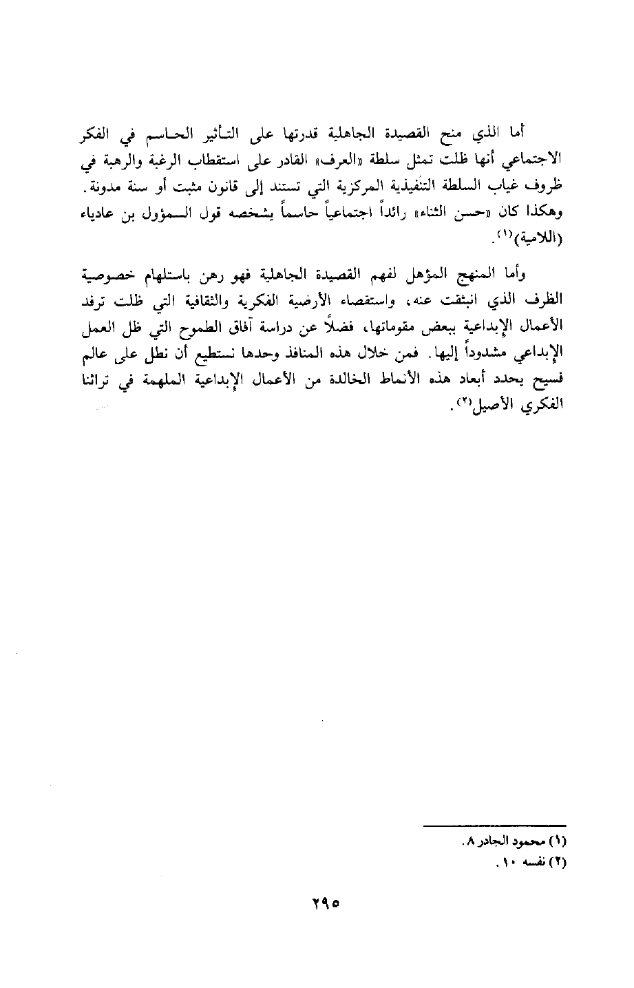 وأما المنهج المؤهل لفهم القصيدة الجاهلية, فهو رهن باستلهام خصوصية الظرف الذي انبثقت عنه، واستقصاء الأرضية الفكرية والثقافية التي ظلت ترفد الأعمال الإبداعية ببعض مقوماتها، فضلًا عن دراسة آفاق الطموح التي ظلّ العمل الإبداعي مشدودًا إليها, فمن خلال هذه المنافذ وحدها نستطيع أن نطل على عالم فسيح يحدد أبعاد هذه الأنماط الخالدة من الأعمال الإبداعية الملهمة في تراثنا الفكري الأصيل2.