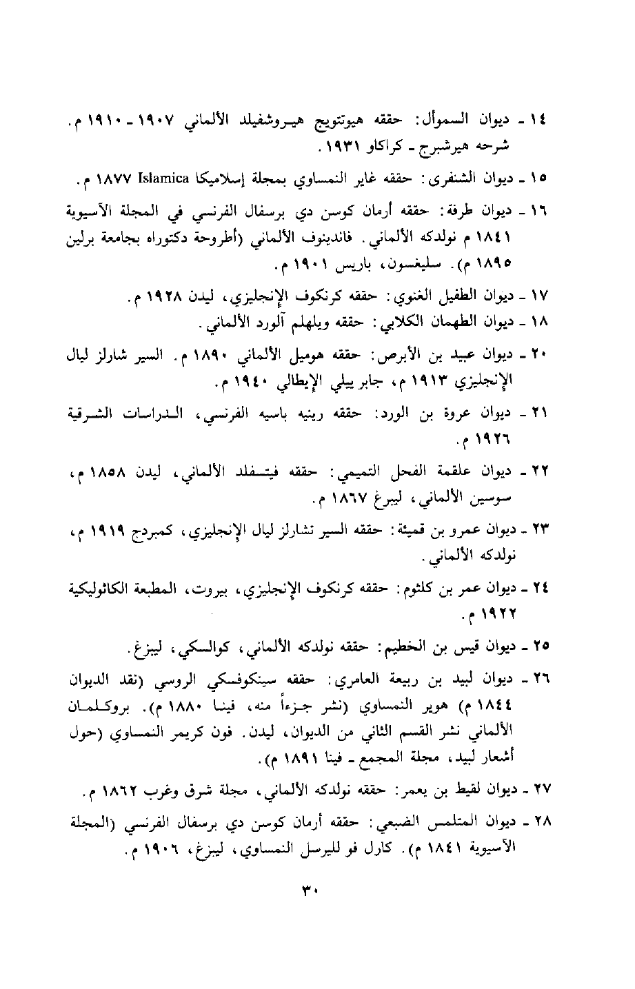 25- ديوان لبيد بن ربيعة العامري: حققه سينكوفسكي الروسي "نقد الديوان 1844م" هوير النمساوي, "نشر جزءًا منه، فينا 1880"، بروكلمان الألماني نشر القسم الثاني من الديوان، ليدن, فون كريمر النمساوي "حول أشعار لبيد، مجلة المجمع, فينا1891م".