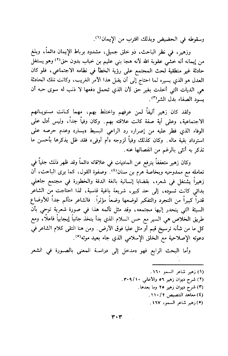 وكان زهير متعففًا يترفع عن الماديات في علاقاته دائمًا, وقد ظهر ذلك جليًّا في تعامله مع ممدوحيه وبخاصة هرم بن سنان4, وصفوة القول، كما يرى الباحث، أن زهيرًا يشتغل في شعره، بقضايا إنسانية بالغة الدقة والخطورة في مجتمع جاهلي بدائي كانت تسوده، إلى حد كبير، شريعة باغية قاسية، لذا احتاجت من الشاعر قدرًا كبيرًا من التجرد والتفكير لوضعها وضعًا مؤثرًا. فالشاعر متألم جدًّا للأوضاع السيئة التي ينحدر إليها مجتمعه, وقد مثّل تألمه هذا في صورة شعرية توحي بأن طريق الخلاص هي السير مع حسّ السلام الذي بدأ يتخذ جانبًا إيجابيًّا فاعلًا، ومع كل ما من شأنه ترسيخ قيمٍ أو مُثُلٍ عليا فوق الأرض. ومن هنا التقى كلام الشاعر في دعوته الإصلاحية مع الخلق الإسلامي الذي جاء بعيد موته5.