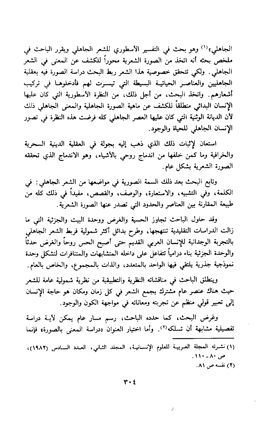 الجاهلي"1, وهو بحث في التفسير الأسطوري للشعر الجاهلي, ويقرر الباحث في ملخص بحثه أنه اتخذ من الصورة الشعرية محورًا للكشف عن المعنى في الشعر الجاهلي. ولكي تتحقق خصوصية هذا الشعر ربط البحث دراسة الصورة فيه بعقلية الجاهليين, والعناصر الحياتية البسيطة التي تيسرت لهم, فأدخلوها في تركيب أشعارهم, واتخذ البحث -من أجل ذلك- من النظرة الأسطورية التي كان عليها الإنسان البدائي منطلقًا للكشف عن ماهية الصورة الجاهلية والمعنى الجاهلي, ذلك لأن الديانة الوثنية التي كان عليها العصر الجاهلي كله فرضت هذه النظرة في تصور الإنسان الجاهلي للحياة والوجود.