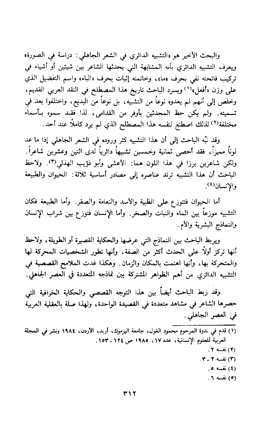 والبحث الأخير هو "التشبيه الدائري في الشعر الجاهلي: دراسة في الصورة", ويعرف التشبيه الدائري بأنه المشاهبة التي يحدثها الشاعر بين شيئين أو أشياء في تركيب فاتحته نفي بحرف "ما"، وخاتمته إثبات بحرف "الباء", واسم التفضيل الذي على وزن "أفعل"1, ويسرد الباحث تاريخ هذا المصطلح في النقد العربي القديم، وخلص إلى أنهم لم يعدوه نوعًا من التشبيه، بل نوعًا من البديع، واختلفوا بعد في تسميته. ولم يكن حظ المحدثين بأوفر من القدامى، لذا فقد سموه بأسماء مختلفة2, لذلك اصطنع لنفسه هذا المصطلح الذي لم يرد كاملًا عند أحد.