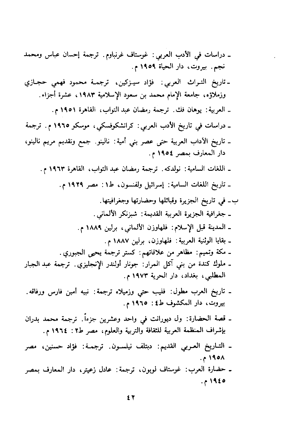 - تاريخ التراث العربي: فؤاد سيزكين، ترجمة: محمود فهمي حجازي وزملاءه, جامعة الإمام محمد بن سعود الإسلامية 1983، عشرة أجزاء.