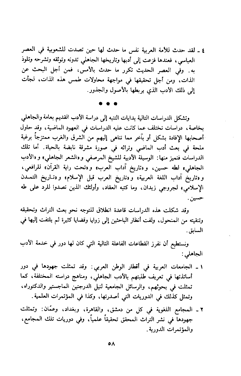 4- لقد حدث للأمة العربية نفس ما حدث لها حين تصدت للشعوبية في العصر العباسي، فعندها فزعت إلى أدبها وتاريخها الجاهلي تدونه وتوثّقه وتشرحه وتلوذ به, وفي العصر الحديث تكرَّر ما حدث بالأمس، فمن أجل البحث عن الذات، ومن أجل تحقيقها في مواجهة محاولات طمس هذه الذات، لجأت إلى ذلك الأدب الذي يربطها بالأصول والجذور.