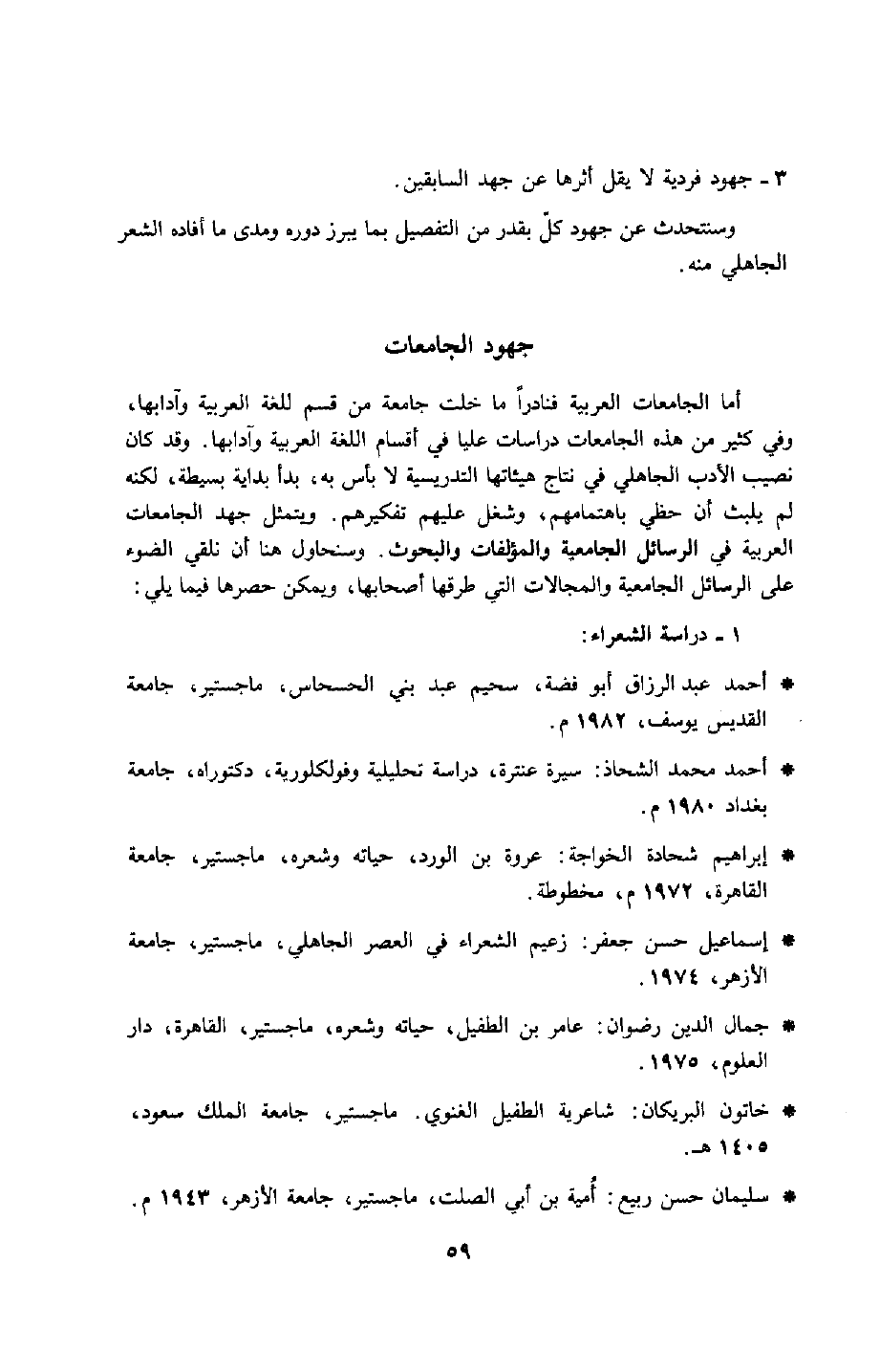 أما الجامعات العربية فنادرًا ما خلت جامعة من قسمٍ للغة العربية وآدابها، وفي كثير من هذه الجامعات دراسات عليا في أقسام اللغة العربية وآدابها، وقد كان نصيب الأدب الجاهلي في نتاج هيئاتها التدريسية لا بأس به، بدأ بداية بسيطة، لكنه لم يلبث أن حظي باهتمامهم، وشغل عليهم تفكيرهم، ويتمثّل جهد الجامعات العربية في الرسائل الجامعية والمؤلفات والبحوث. وسنحاول هنا أن نلقي الضوء على الرسائل الجامعية والمجالات التي طرقها أصحابها، ويمكن حصرها فيما يلي: