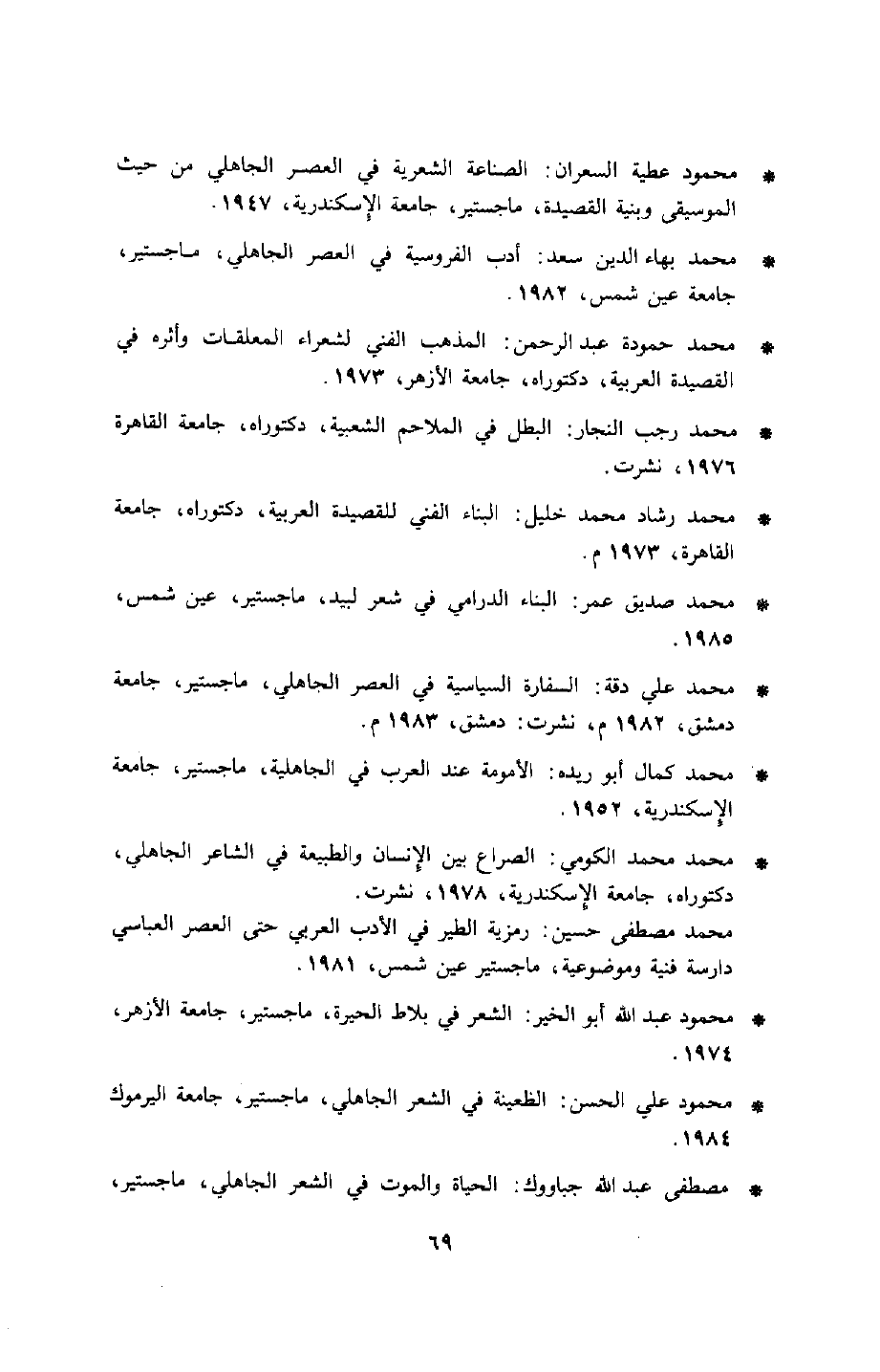 - محمود عطية السعران: الصناعة الشعرية في العصر الجاهلي من حيث الموسيقى وبنية القصيدة، ماجستير، جامعة الإسكندرية، 1947.