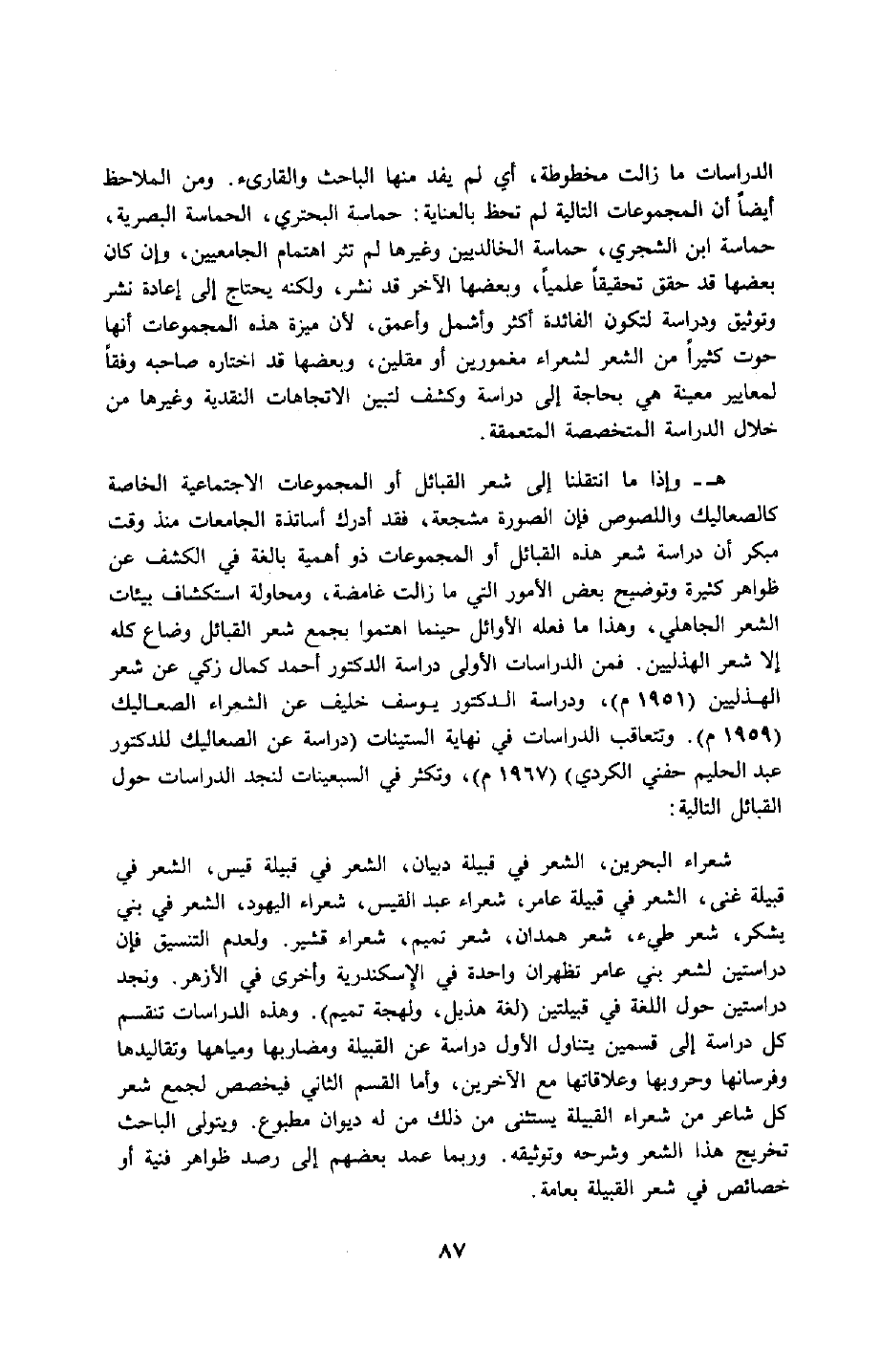 هـ- وإذا ما انتقلنا إلى شعر القبائل أو المجموعات الاجتماعية الخاصة كالصعاليك اللصوص, فإن الصورة مشجّعة، فقد أدرك أساتذة الجامعات منذ وقت مبكِّر أن دراسة شعر هذه القبائل أو المجموعات ذو أهمية بالغة في الكشف عن ظواهر كثيرة, وتوضيح بعض الأمور التي ما زالت غامضة، ومحاولة استكشاف بيئات الشعر الجاهلي، وهذا ما فعله الأوائل حينما اهتمّوا بجمع شعر القبائل وضاع كله إلّا شعر الهذليين. فمن الدراسات الأولى دراسة الدكتور أحمد كمال زكي عن شعر الهذليين "1951م"، دراسة الدكتور يوسف خليف عن الشعراء الصعاليك "1959م"، وتتعاقب الدراسات في نهاية الستينات "دراسة عن الصعاليك للدكتور عبد الحليم حفني الكردي 1967م"، وتكثر في السبعينات لنجد الدراسات حول القبائل التالية: