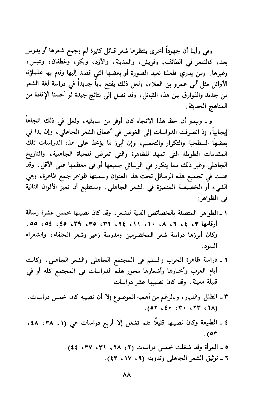 3- الطلل والديار، وبالرغم من أهمية الموضوع إلّا أن نصيبه كان خمس دراسات، "18، 23، 30، 40، 52".