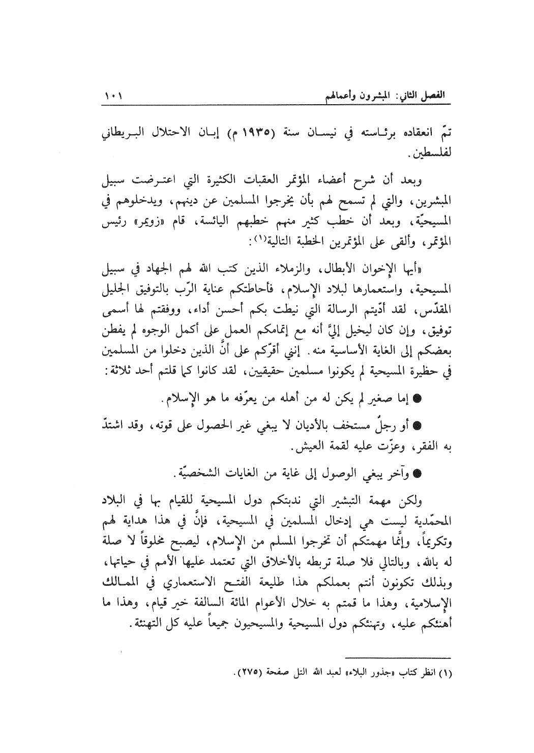 ولكن مهمة التبشير التي ندبتكم دول المسيحية للقيام بها في البلاد المحمّدية ليست هي إدخال المسلمين في المسيحية، فإنَّ في هذا هداية لهم وتكريماً، وإنما مهمتكم أن تخرجوا المسلم من الإسلام، ليصبح مخلوقاً لا صلة له بالله، وبالتالي فلا صلة تربطه بالأخلاق التي تعتمد عليها الأمم في حياتها، وبذلك تكونون أنتم بعملكم هذا طليعة الفتح الاستعماري في الممالك الإسلامية. وهذا ما قمتم به خلال الأعوام المائة السالفة خير قيام، وهذا ما أهنئكم عليه، وتهنئكم الدول المسيحية والمسيحيون جميعاً عليه كل التهنئة.