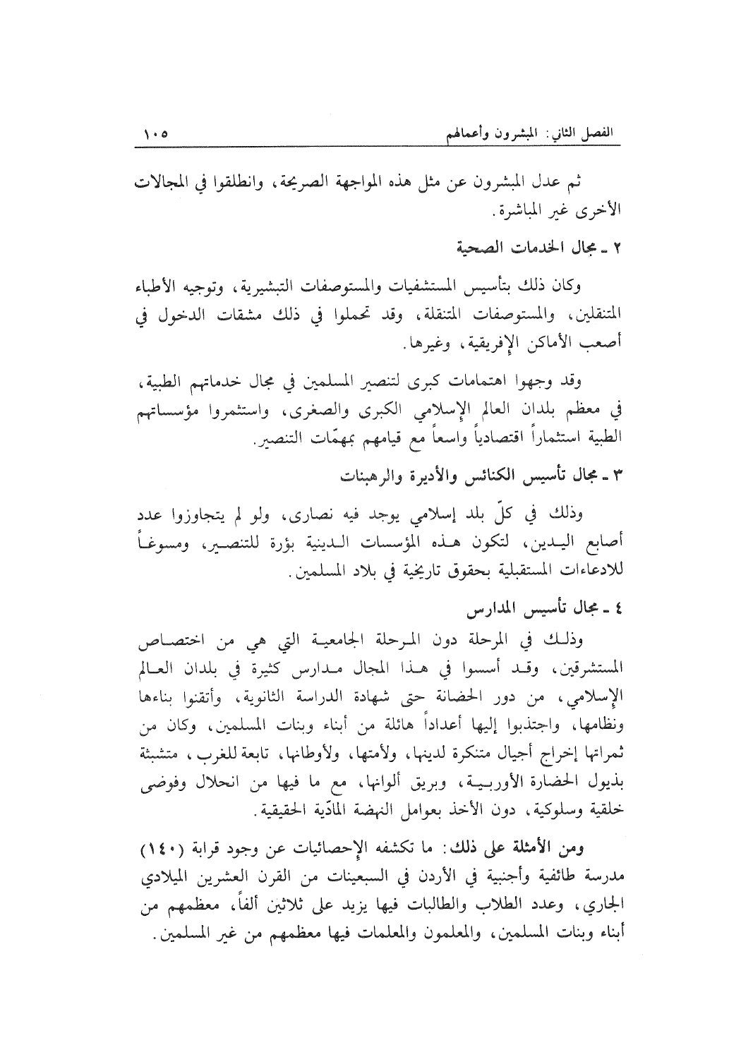 وذلك في كل بلد إسلامي يوجد فيه نصارى، ولو لم يتجاوزوا عدد أصابع اليدين، لتكون هذه المؤسسات الدينية بؤرة للتنصير، ومسوغاً للادعاءات المستقبلية بحقوق تاريخية في بلاد المسلمين.
