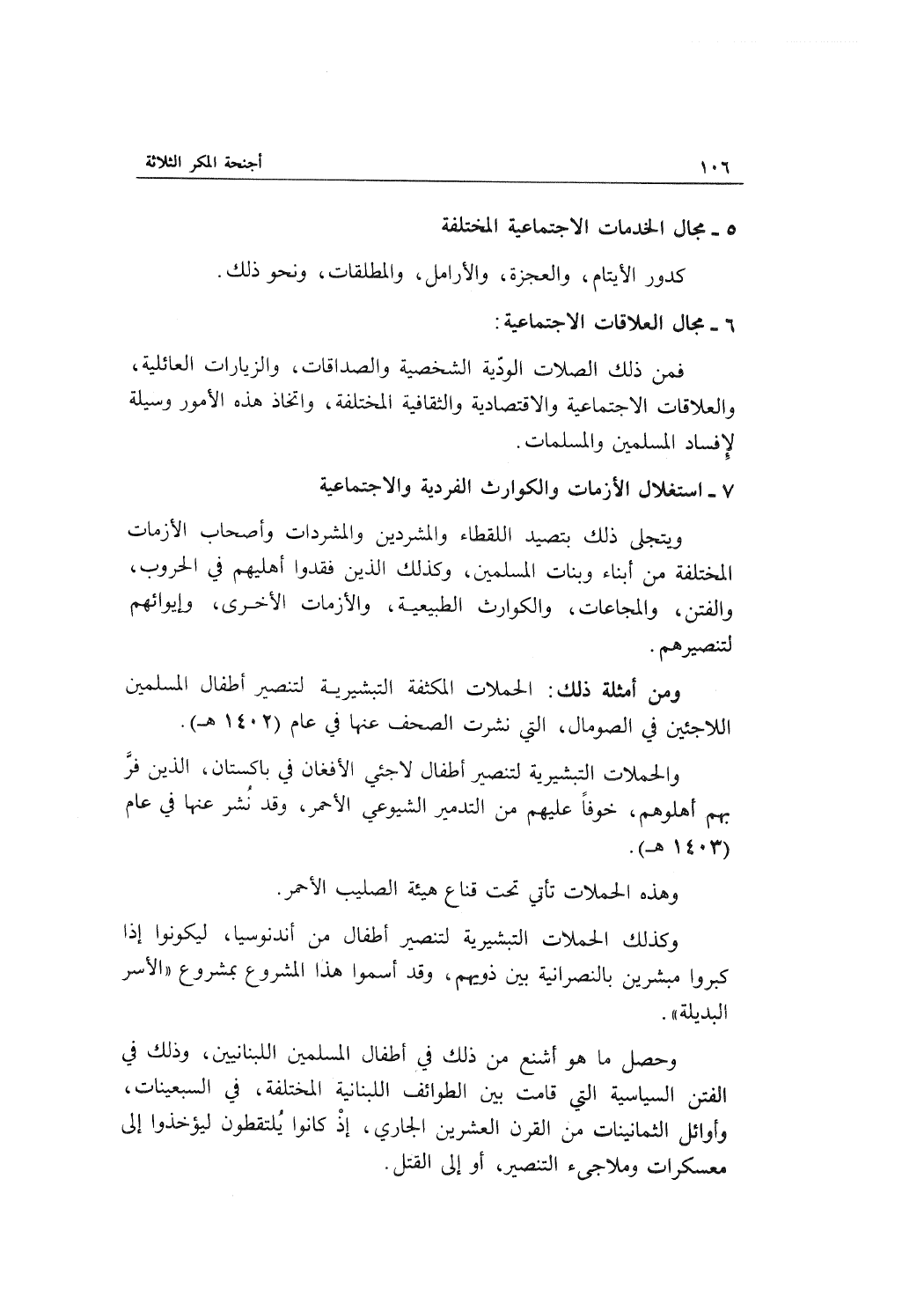 ومن أمثلة ذلك: الحملات المكثفة التبشيرية لتنصير أطفال المسلمين اللاجئين في الصومال، التي نشرت الصحف عنها في عام (1402م) .