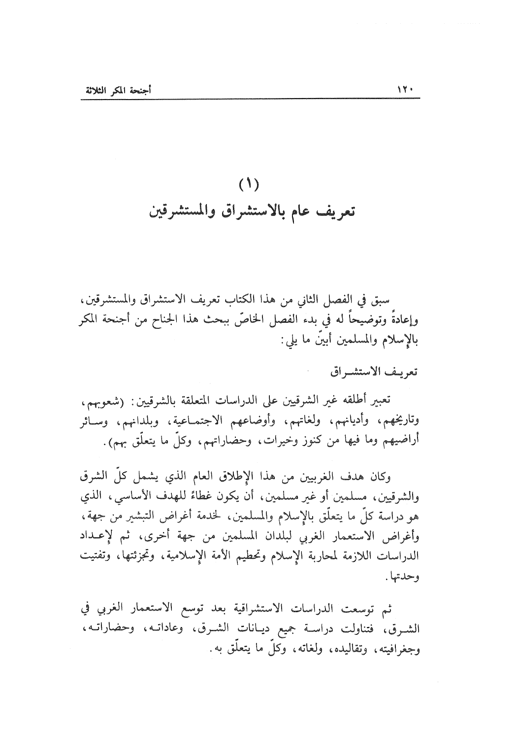 سبق في الفصل الثاني من هذا الكتاب تعريف الاستشراق والمستشرقين، وإعادةً توضيحاً له في بدء الفصل الخاصّ ببحث هذا الجناح من أجنحة المكر بالإسلام والمسلمين أبيّن ما يلي: