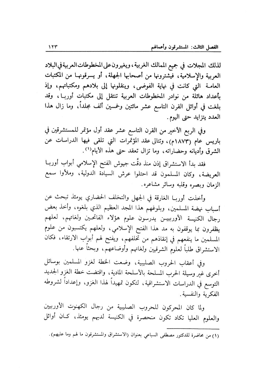 وفي الربع الأخير من القرن التاسع عشر عقد أول مؤتمر للمستشرقين في باريس عام (1873م) ، وتتالى عقد المؤتمرات التي تلقى فيها الدراسات عن الشرق وأديانه وحضاراته، وما تزال تعقد حتى هذه الأيام.
