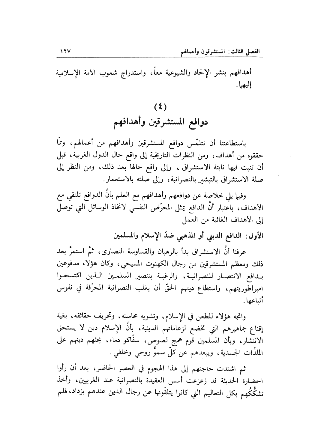 عرفنا أن الاستشراق بدأ بالرهبان والقساوسة والنصارى، ثم استمر بعد ذلك ومعظم المستشرقين من رجال الكهنوت المسيحي، وكان هؤلاء مدفوعين بدافع الانتصار للنصرانية، والرغبة بتنصير المسلمين الذين اكتسحوا امبراطوريتهم واستطاع دينهم الحق أن يغلب النصرانية المحرفة في نفوس أتباعها.