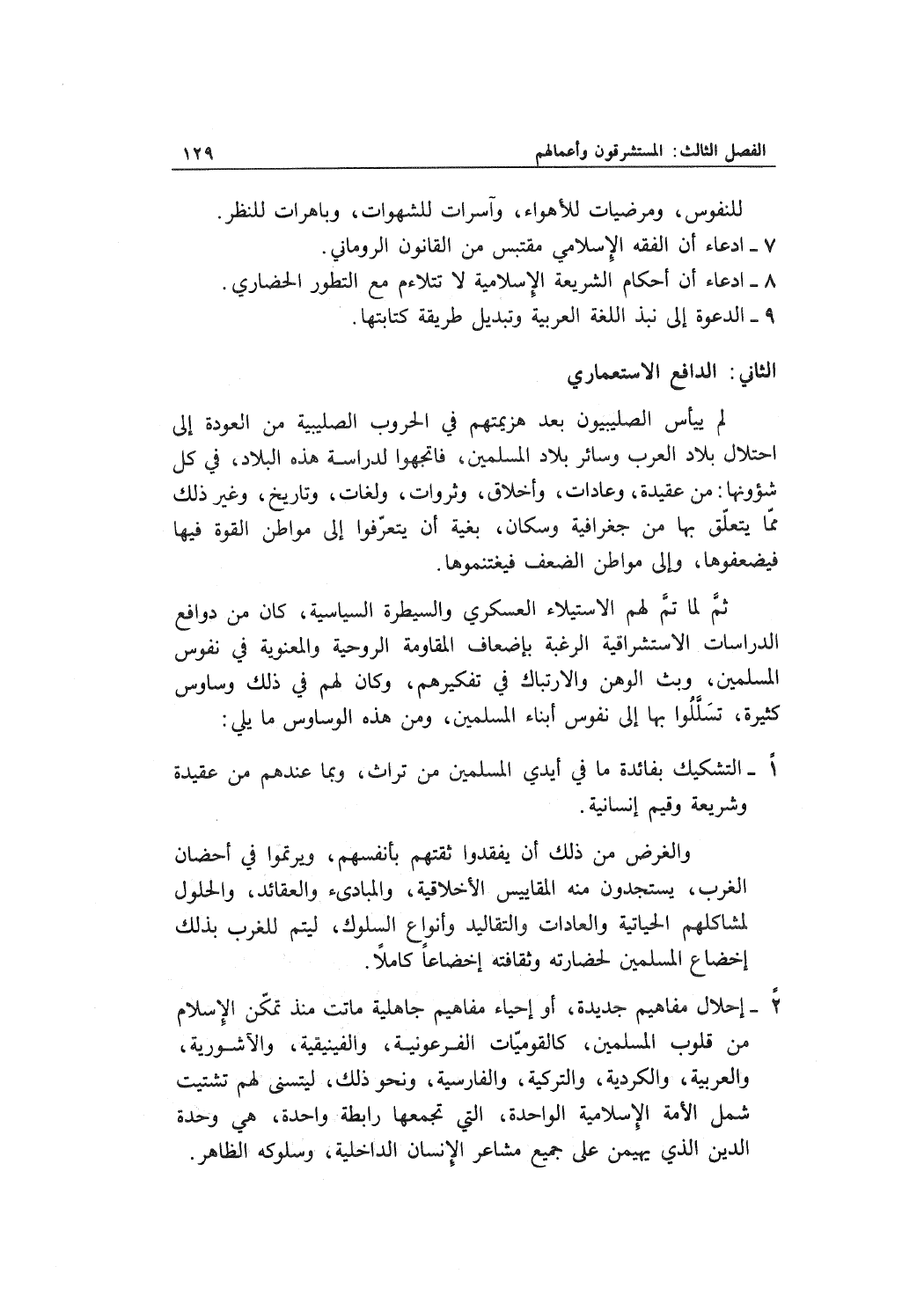 1 ً- التشكيك بفائدة ما في أيدي المسلمين من تراث، وبما عندهم من عقيدة وشريعة وقيم إنسانية.