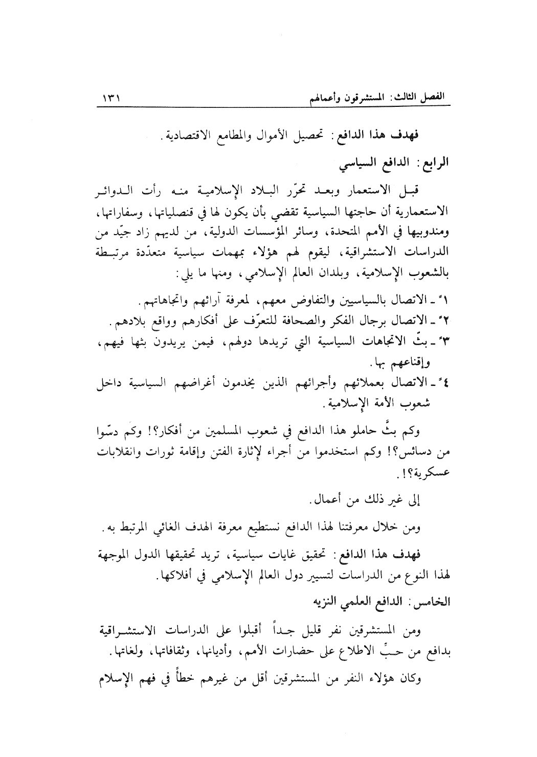 فهدف هذا الدافع: تحقيق غايات سياسية، تريد تحقيقها الدول الموجهة لهذا النوع من الدراسات لتسيير دول العالم الإسلامي في أفلاكها.