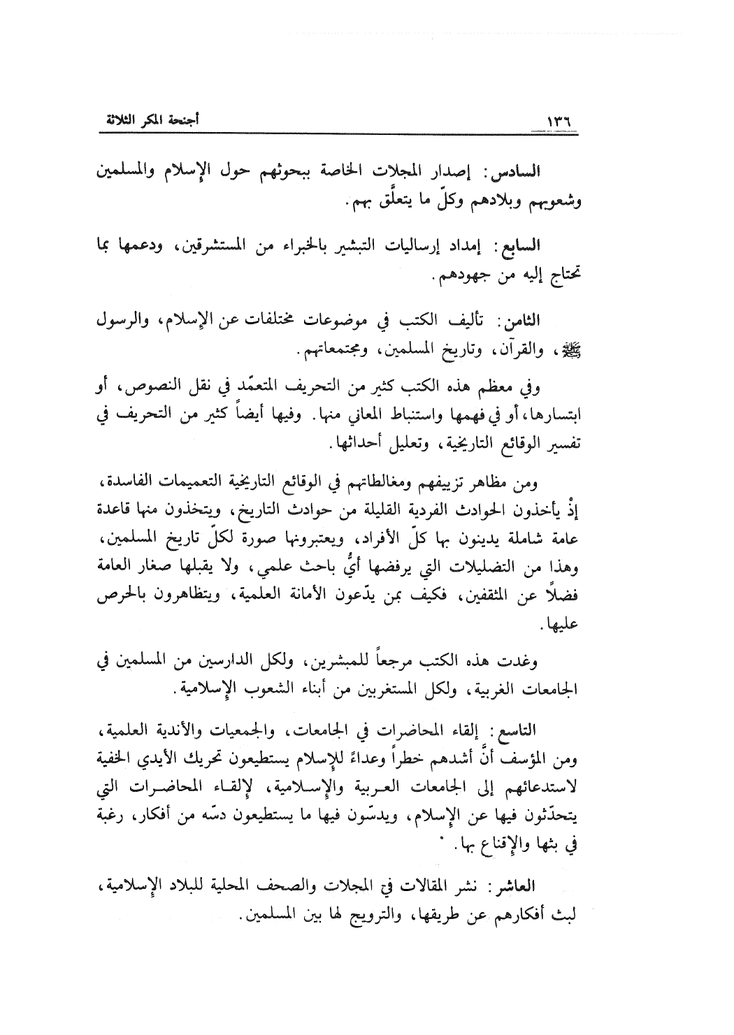 الثامن: تأليف الكتب في موضوعات مختلفات عن الإسلام، والرسول، والقرآن وتاريخ المسلمين ومجتمعاتهم.