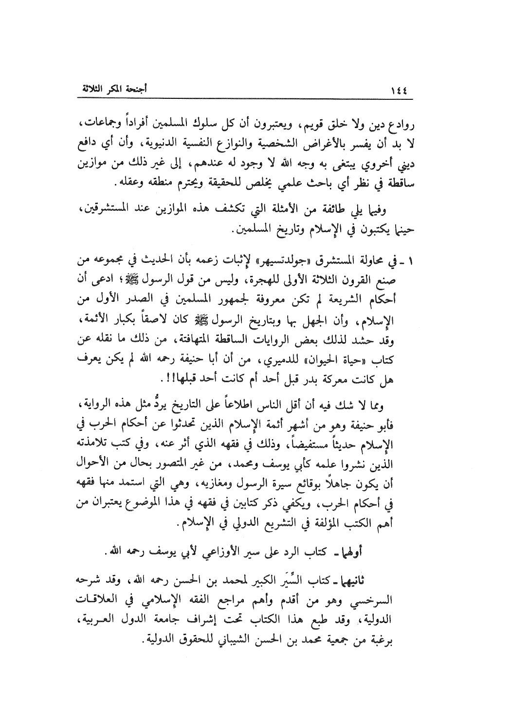 ثانيهما - كتاب السير الكبير لمحمد بن الحسن رحمه الله، وقد شرحه السرخسي وهو من أقدم وأهم مراجع الفقه الإسلامي في العلاقات الدولية، وقد طبع هذا الكتاب تحت إشراف جامعة الدول العربية، برغبة من جمعية محمد بن الحسن الشيباني للحقوق الدولية.