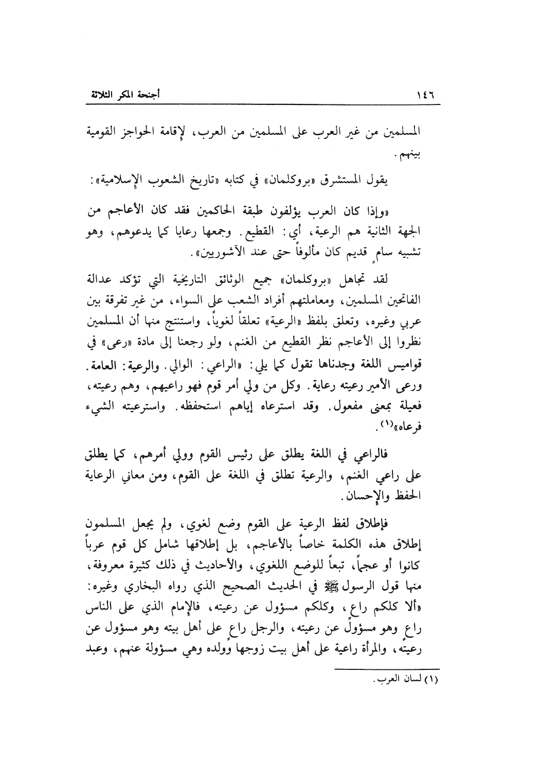 "وإذا كان العرب يؤلفون طبقة الحاكمين فقد كان الأعاجم من الجهة الثانية هم الرعية، أي: القطيع. وجمعها رعايا كما يدعوهم، وهو تشبيه سامٍ قديم كان مألوفاً حتى عند الآشوريين".