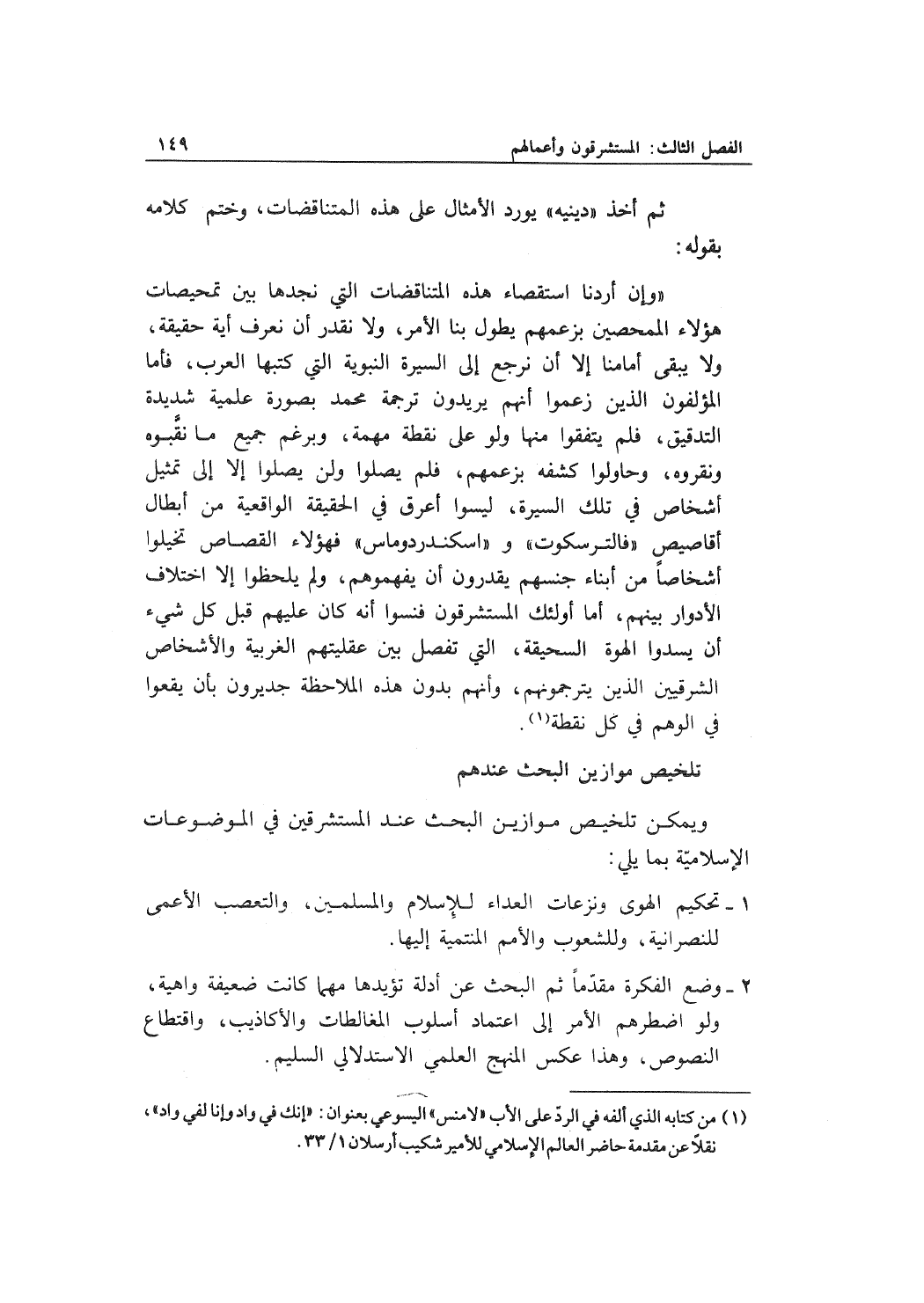 "وإن أردنا استقصاء هذه المتناقضات التي نجدها بين تمحيصات هؤلاء الممحصين بزعمهم يطول بنا الأمر، ولا نقدر أن نعرف أية حقيقة، ولا يبقى أمامنا إلا أن نرجع إلى السيرة النبوية التي كتبها العرب، فأما المؤلفون الذين زعموا أنهم يريدون ترجمة محمد بصورة عملية شديدة التدقيق، فلم يتفقوا منها ولو على نقطة مهمة، وبرغم جميع ما نقبوه ونقروه، وحاولوا كشفه بزعمهم، فلم يصلوا ولن يصلوا إلا إلى تمثيل أشخاص في تلك السيرة،ليسوا أعرق في الحقيق الواقعية من أبطال أقاصيص "فالترسكوت" و"اسكندردوماس" فهؤلاء القصاص تخيلوا أشخاصاً من أبناء جنسهم يقدرون أن يفهموهم، ولم يلحظوا إلا اختلاف الأدوار بينهم، أما أولئك المستشرقون فنسوا أنه كان عليهم قبل كل شيء أن يسدوا الهوة السحيقة التي تفصل بين عقليتهم الغربية والأشخاص الشرقيين الذين يترجمونهم،وأنهم بدون هذه الملاحظة جديرون بأن يقعوا في الوهم في كل نقطة.