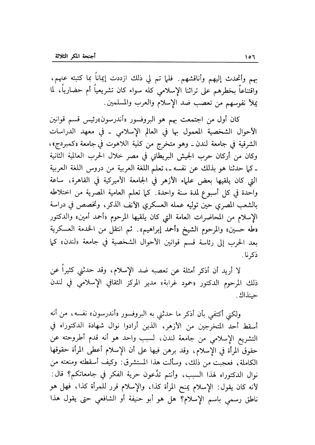 ولكني أكتفي بأن أذكر ما حدثني به البروفسور "أندرسون" نفسه، من أنه أسقط أحد المتخرجين من الأزهر، الذين أرادوا نوال شهادة الدكتوراه في التشريع الإسلامي من جامعة لندن، لسبب واحد هو أنه قدم أطروحته عن حقوق المرأة في الإسلام، وقد برهن فيها على أن الإسلام أعطى المرأة حقوقها الكاملة، فعجبت من ذلك، وسألت هذا المستشرق: وكيف أسقطته ومنعته من نوال الدكتوراه لهذا السبب، وأنتم تدعون حرية الفكر في جامعاتكم؟ قال: