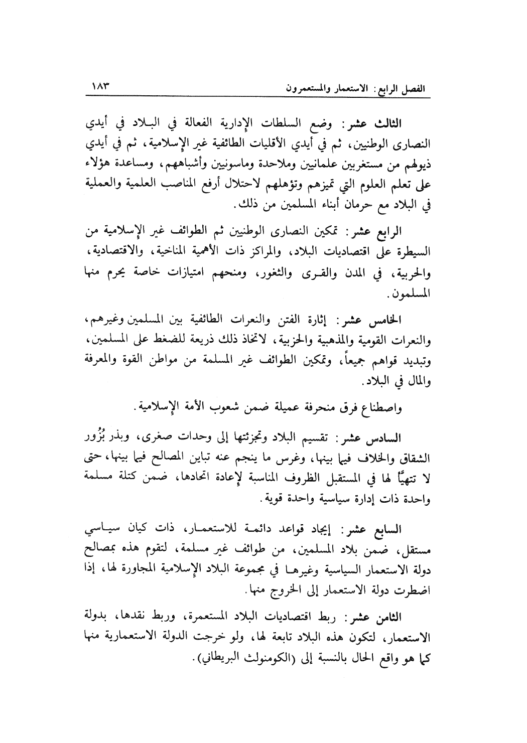 الثالث عشر: وضع السلطات الإدارية الفعالة في البلاد في أيدي النصارى الوطنيين , ثم في أيدي الأقليات الطائفية غير الإسلامية , ثم في أيدي ذيولهم من مستغربين علمانيين وملاحدة وماسونيين وأشباههم , ومساعدة هؤلاء على تعلم العلوم التي تميزهم وتؤهلهم لاحتلال أرفع المناصب العلمية والعملية في البلاد مع حرمان أبناء المسلمين من ذلك.
