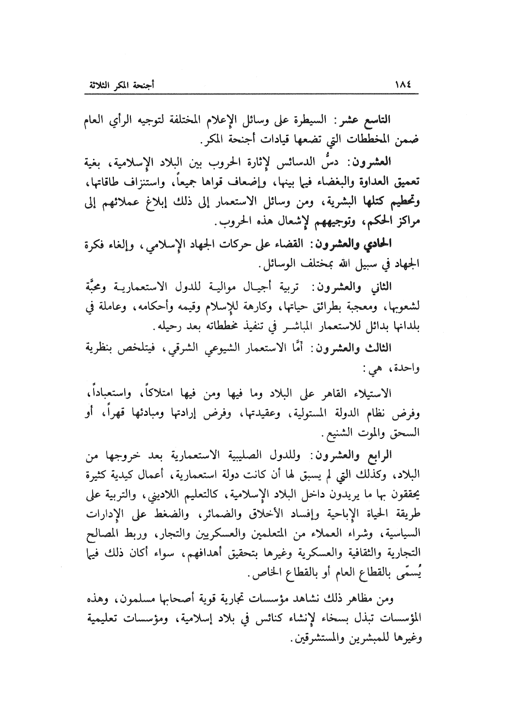 الرابع والعشرون: وللدول الصليبية الاستعمارية بعد خروجها من البلاد , وكذلك التي لم يسبق لها أن كانت دولة استعمارية , أعمال كيدية كثيرة يحققون بها ما يريدون داخل البلاد الإسلامية , كالتعليم اللاديني , والتربية على طريقة الحياة الإباحية وإفساد الأخلاق والضمائر , والضغط على الإدارات السياسية , وشراء العملاء من المتعلمين والعسكريين والتجار , وربط المصالح التجارية والثقافية والعسكرية وغيرها بتحقيق أهدافهم , سواء أكان ذلك فيما يسمى بالقطاع العام أو بالقطاع الخاص.