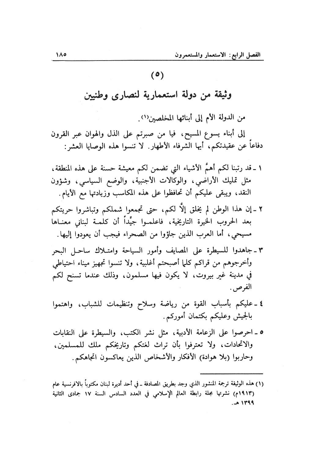 5- احرصوا على الزعامة الأدبية , مثل نشر الكتب , والسيطرة على النقابات والاتحادات , ولا تعترفوا بأن تراث لغتكم وتاريخكم ملك للمسلمين , وحاربوا (بلا هوادة) الأفكار والأشخاص الذين يعاكسون اتجاهكم.