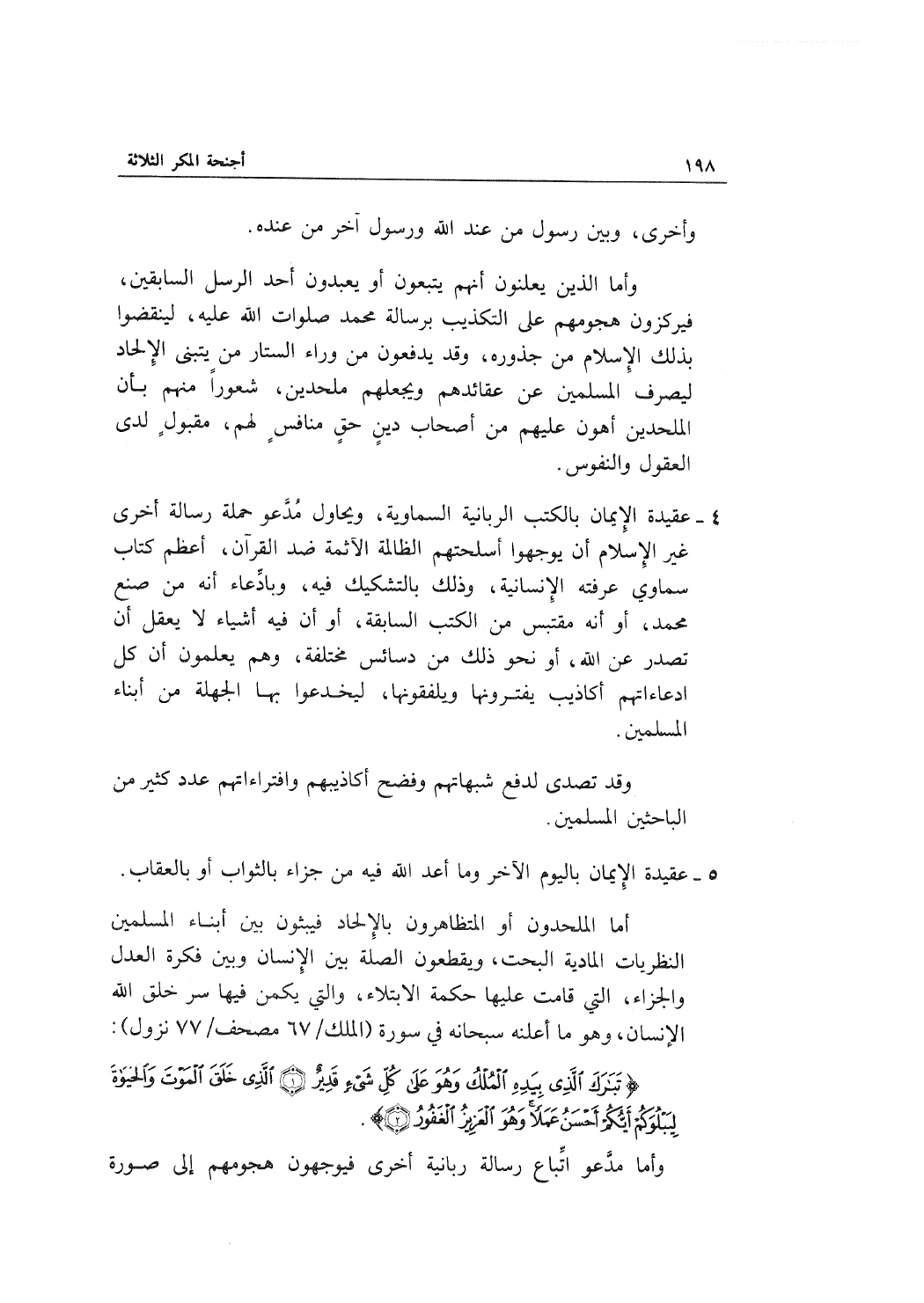 4- عقيدة الإيمان بالكتب الربانية السماوية , ويحاول مدعو حملة رسالة أخرى غير الإسلام أن يوجهوا أسلحتهم الظالمة الآثمة ضد القرآن , أعظم كتاب سماوي عرفته الإنسانية , وذلك بالتشكيك فيه , وبادعاء أنه من صنع محمد , أو أنه مقتبس من الكتب السابقة , أو أن فيه أشياء لا يعقل أن تصدر عن الله , أو نحو ذلك من دسائس مختلفة , وهم يعلمون أن كل ادعاءاتهم أكاذيب يفترونها ويلفقونا , ليخدعوا بها الجهلة من أبناء المسلمين.