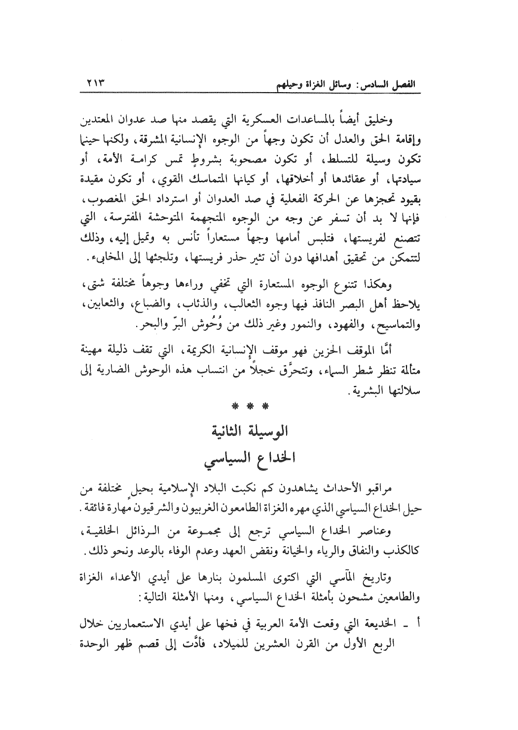 مراقبو الأحداث يشاهدون كم نكبت البلاد الإسلامية بحيلٍ مختلفة من حيل الخداع السياسي الذي مهره الغزاة الطامعون الغربيون والشرقيون مهارة فائقة.