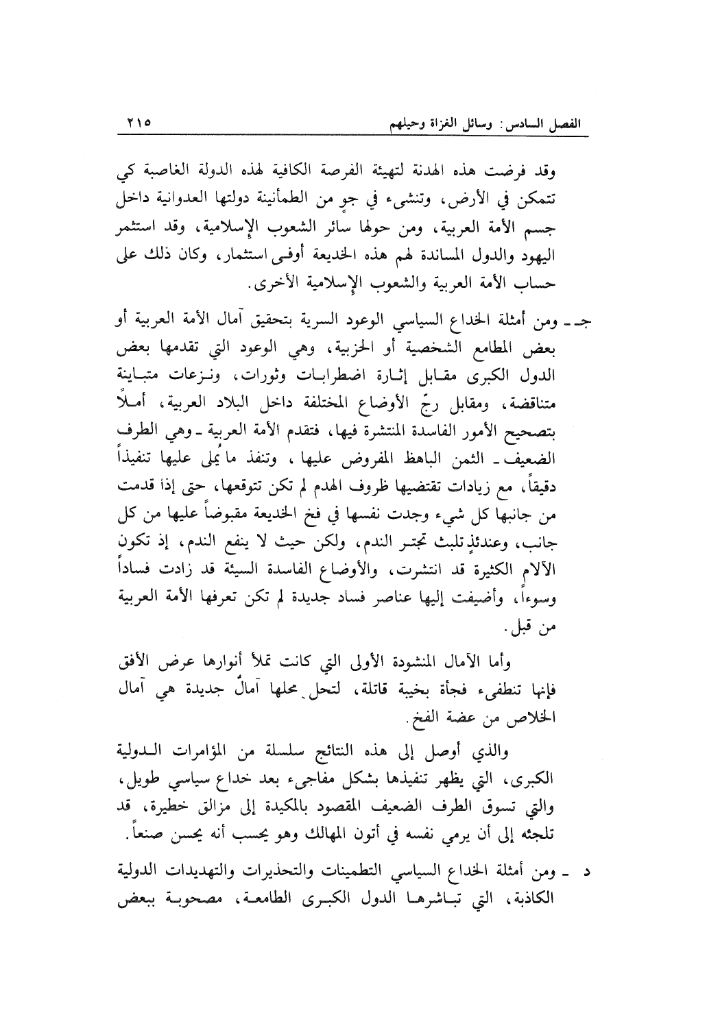 جـ - ومن أمثلة الخداع السياسي الوعود السرية بتحقيق آمال الأمة العربية أو بعض المطامع الشخصية أو الحزبية , وهي الوعود التي تقدمها بعض الدول الكبرى مقابل إثارة اضطرابات وثورات , ونزعات متباينة متناقضة , ومقابل رج الأوضاع المختلفة داخل البلاد العربية , أملاً بتصحيح الأمور الفاسدة المنتشرة فيها , فتقدم الأمة العربية - وهي الطرف الضعيف - الثمن الباهظ المفروض عليها , وتنفذ ما يملى عليها تنفيذاً دقيقاً , مع زيادات تقتضيها ظروف الهدم لم تكن تتوقعها , حتى إذا قدمت من جانبها كل شيء وجدت نفسها في فخ الخديعة مقبوضاً عليها من كل جانب , وعندئذ تلبث تجتر الندم , ولكن حيث لا ينفع الندم , إذ تكون الآلام الكثيرة قد انتشرت , والأوضاع الفاسدة السيئة قد زادة فساداً وسوءاً , وأضيفت إليها عناصر فساد جديدة لم تكن تعرفها الأمة العربية من قبل.