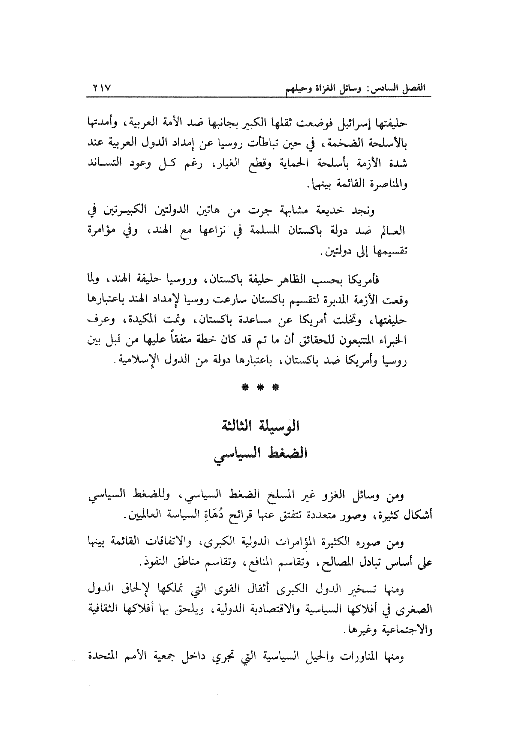 ومن وسائل الغزو غير المسلح الضغط السياسي، وللضغط السياسي أشكال كثيرة، وصور متعددة تتفتق عنها قرائح دُهَاةٍ السياسة العالميين.