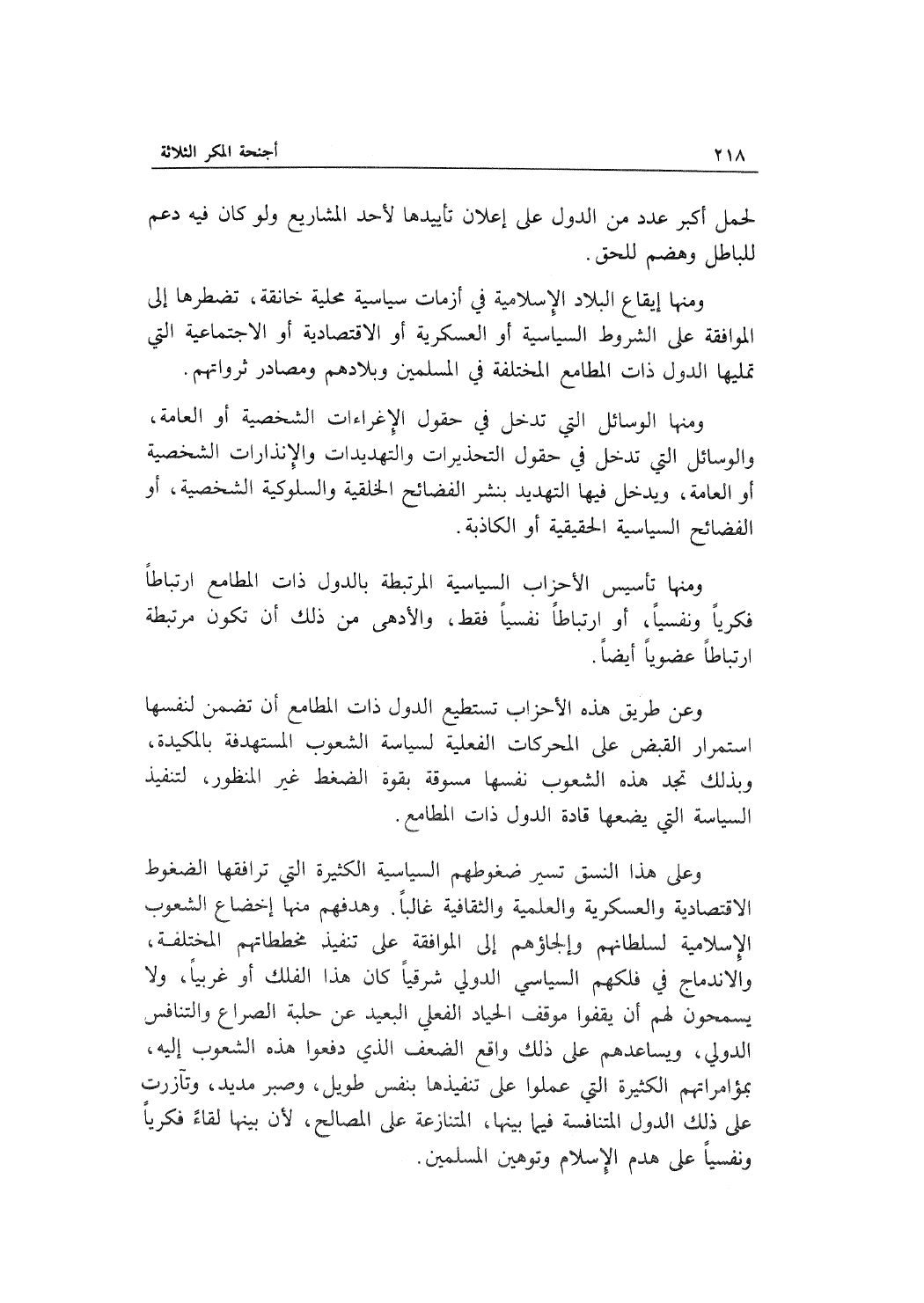 وعلى هذا النسق تسير ضغوطهم السياسية الكثيرة التي ترافقها الضغوط الاقتصادية والعسكرية والعلمية والثقافية غالباً. وهدفهم منها إخضاع الشعوب الإسلامية لسلطانهم وإلجاؤهم إلى الموافقة على تنفيذ مخططاتهم المختلفة، والاندماج في فلكهم السياسي الدولي شرقياً كان هذا الفلك أو غربياً، ولا يسمحون لهم أن يقفوا موقف الحياد الفعلي البعيد عن حلبة الصراع والتنافس الدولي، ويساعدهم على ذلك واقع الضعف الذي دفعوا هذه الشعوب إليه، بمؤامراتهم الكبيرة التي عملوا على تنفيذها بنفس طويل، وصبر مديد، وتآزرت على ذلك الدول المتنافسة فيما بينها، المتنازعة على المصالح، لأن بينها لقاءً فكرياً ونفسياً على هدم الإسلام وتوهين المسلمين.