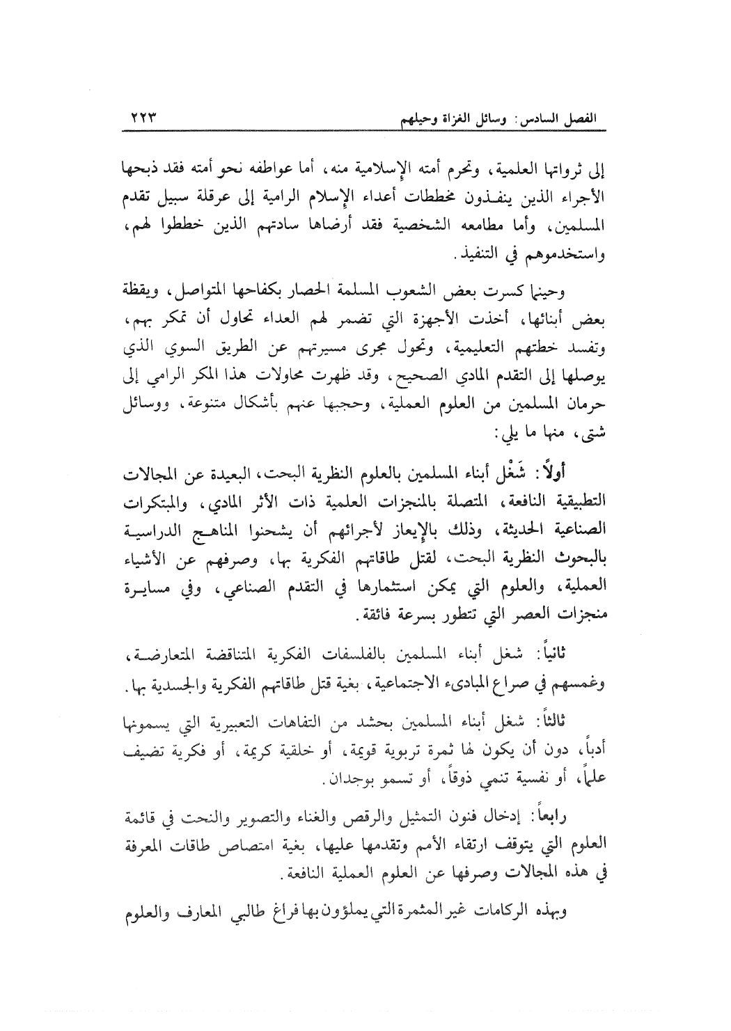 أولاً: شَغْل أبناء المسلمين بالعلوم النظرية البحت، البعيدة عن المجالات التطبيقة النافعة، المتصلة بالمنجزات العلمية ذات الأثر المادي، والمبتكرات الصناعية الحديثة، وذلك بالإيعاز لأجرائهم أن يشحنوا المناهج الدراسية بالبحوث النظرية البحت، لقتل طاقاتهم الفكرية بها، وصرفهم عن الأشياء العلمية، والعلوم التي يمكن استثمارها في التقدم الصناعي، وفي مسايرة منجزات العصر التي تتطور بسرعة فائقة.