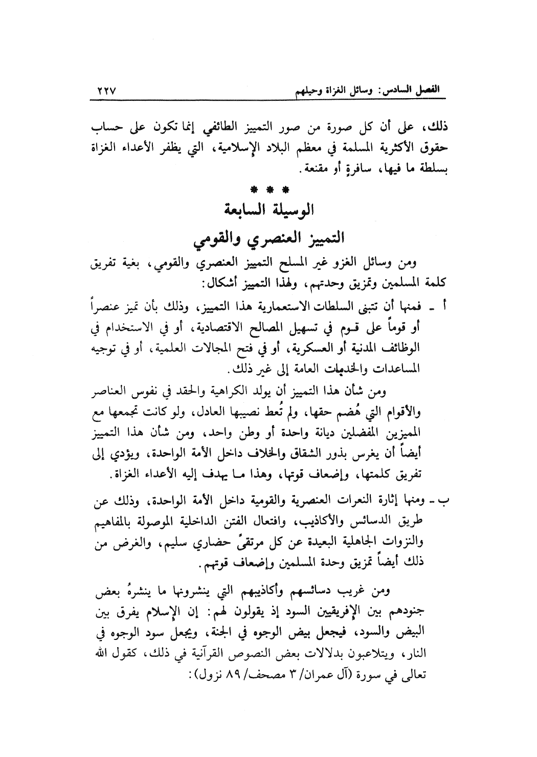 ومن وسائل الغزو غير المسلح التمييز العنصري والقومي، بغية تفريق كلمة المسلمين وتمزيق وحدتهم، ولهذا التمييز أشكال:
