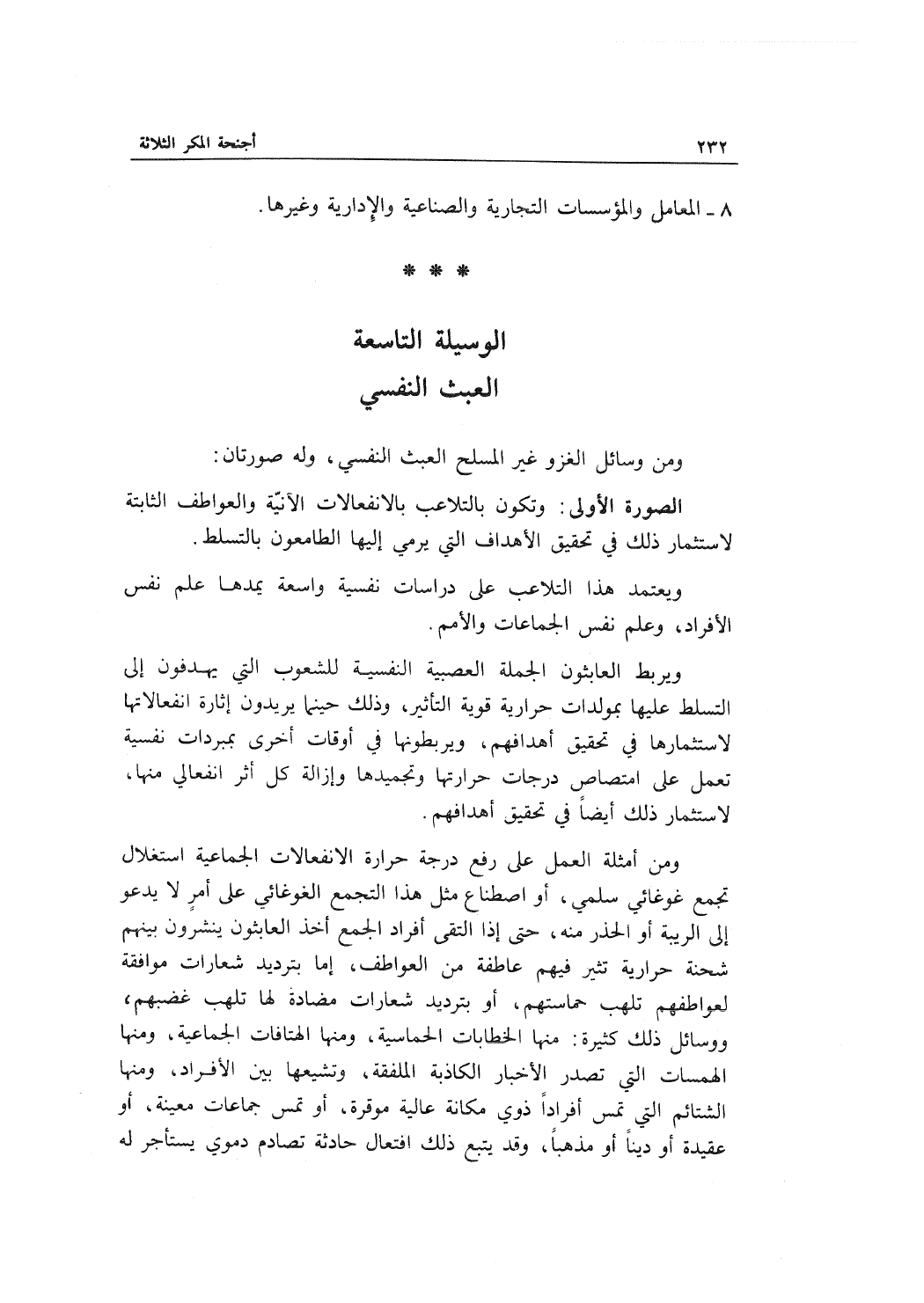 ويربط العابثون الجملة العصبية النفسية للشعوب التي يهدفون إلى التسلط عليها بمولدات حرارية قوية التأثير، وذلك حينما يريدون إثارة انفعالاتها لاستثمارها في تحقيق أهدافهم، ويربطونها في أوقات أخرى بمبردات نفسية تعمل على امتصاص درجات حرارتها وتجميدها وإزالة كل أثر انفعالي منها، لاستثمار ذلك أيضاً في تحقيق أهدافهم.