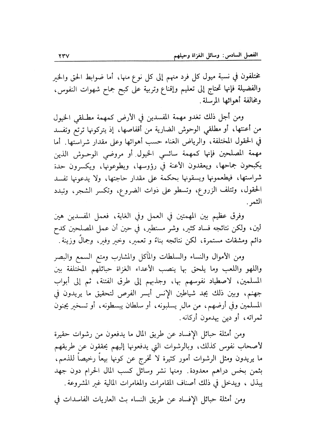 ومن الأموال والنساء والسلطات والمآكل والمشارب ومتع السمع والبصر واللهو واللعب وما يلحق بها ينصب الأعداء الغزاة حبائلهم المختلفة بين المسلمين، لاصطياد نفوسهم بها، وجذبهم إلى طرق الفتنة، ثم إلى أبواب جهنم، وبين ذلك يجد شياطين الإنس أيسر الفرص لتحقيق ما يريدون في المسلمين وفي أرضهم، من مالٍ يسلبونه، أو سلطان يبسطونه، أو تسخير بجنون ثمراته، أو دين يهدمون أركانه.