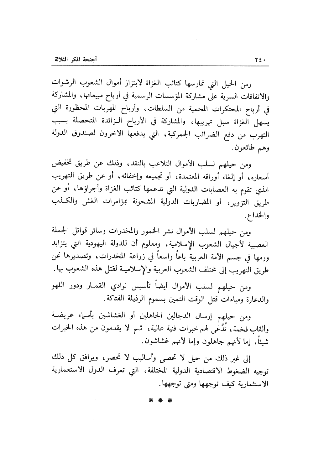 ومن حيلهم لسلب الأموال نشر الخمور والمخدرات وسائر قواتل الجملة العصبية لأجيال الشعوب الإسلامية، ومعلوم أن للدولة اليهودية التي يتزايد ورمها في جسم الأمة العربية باعاً واسعاً في زراعة المخدرات، وتصديرها عن طريق التهريب إلى مختلف الشعوب العربية والإسلامية لقتل هذه الشعوب بها.