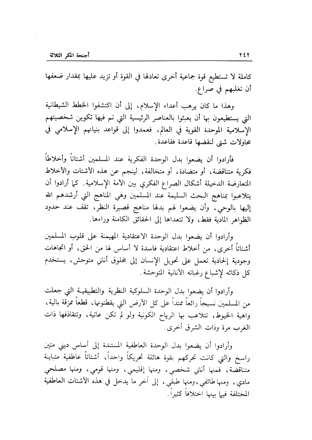 فأرادوا أن يضعوا بدل الوحدة الفكرية عند المسلمين أشتاتاً وأخلاطاً فكرية متناقضة، أو متضادة، أو متخالفة، لينجم عن هذه الأشتات والأخلاط المتعارضة الدخيلة أشكال الصراع الفكري بين الأمة الإسلامية. كما أرادوا أن يتلاعبوا بمناهج البحث السليمة عند المسلمين وهي المناهج التي أرشدهم الله إليها بالوحي، وأن يضعوا لهم بدلها مناهج قصيرة النظر، تقف عند حدود الظواهر المادية، ولا تتعداها إلى الحقائق الكامنة وراءها.