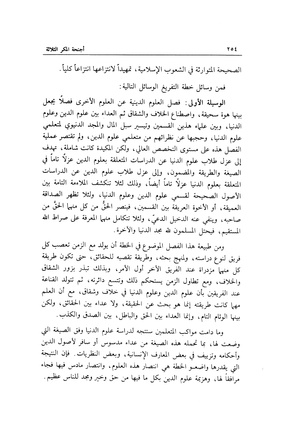 الوسيلة الأولى: فصل العلوم الدينية عن العلوم الأخرى فصلاً يجعل بينها هوة سحيقة، واصطناع الخلاف والشقاق ثم العداء بين علوم الدين وعلوم الدنيا، وبين علماء هذين القسمين وتيسير سبل المال والمجد الدنيوي لمتعلمي علوم الدنيا، وحجبها عن نظرائهم من متعلمي علوم الدين، ولم تقتصر عملية الفصل هذه على مستوى التخصص العالي، ولكن المكيدة كانت شاملة، تهدف إلى عزل طلاب علوم الدنيا عن الدراسات المتعلقة بعلوم الدين عزلاً تاماً في الصيغة والطريقة والمضمون، وإلى عزل طلاب علوم الدين عن الدراسات المتعلقة بعلوم الدنيا عزلاً تاماً أيضاً، وذلك لئلا تنكشف الملاءمة التامة بين الأصول الصحيحة لقسمي علوم الدين وعلوم الدنيا، ولئلا تظهر الصداقة العميقة، أو الأخوة العريقة بين القسمين، فينصر الحقُّ من كل منهما الحقَّ من صاحبه، وينفي عنه الدخيل الدعيّ، ولئلا تتكامل منهما المعرفة على صراط الله المستقيم، فيحتل المسلمون لله مجد الدنيا والآخرة.