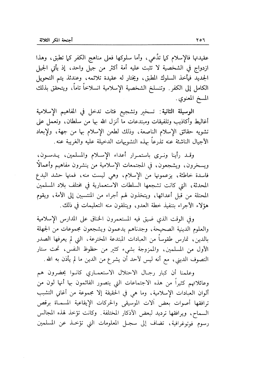 الوسيلة الثانية: تسخير وتشجيع فئات تدخل في المفاهيم الإسلامية أغاليط وأكاذيب وتلفيقات ومبتدعات ما أنزل الله بها من سلطان، وتعمل على تشويه حقائق الإسلام الناصعة، وذلك لطعن الإسلام بها من جهة، ولإبعاد الأجيال الناشئة عنه تذرعاً بهذه التشويهات الدخيلة عليه والغريبة عنه.