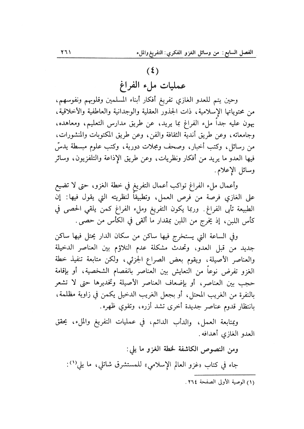 وحين يتم للعدو الغازي تفريغ أفكار أبناء المسلمين وقلوبهم ونفوسهم، من محتوياتها الإسلامية، ذات الجذور العقلية والوجدانية والعاطفية والأخلاقية، يهون عليه جداً ملء الفراغ بما يريد، عن طريق مدارس التعليم، ومعاهده، وجامعاته، وعن طريق أندية الثقافة والفن، وعن طريق المكتوبات والمنشورات، من رسائل، وكتب أخبار، وصحف ومجلات دورية، وكتب علوم مبسطة يدسّ فيها العدو ما يريد من أفكار ونظريات، وعن طريق الإذاعة والتلفزيون، وسائر وسائل الإعلام.