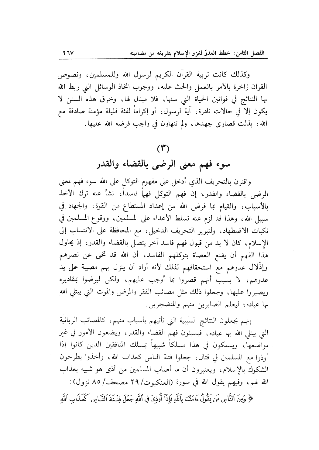واقترن بالتحريف الذي أدخل على مفهوم التوكل على الله سوء فهم لمعنى الرضى بالقضاء والقدر، إن فهم التوكل فهماً فاسداً، نشأ عنه ترك الأخذ بالأسباب، والقيام بما فرض الله من إعداد المستطاع من القوة، والجهاد في سبيل الله، وهذا قد لزم عنه تسلط الأعداء على المسلمين، ووقوع المسلمين في نكبات الاضطهاد، ولتبرير التحريف الدخيل، مع المحافظة على الانتساب إلى الإسلام، كان لا بد من قبول فهم فاسد آخر يتصل بالقضاء والقدر، إذ يحاول هذا الفهم أن يقنع العصاة بتوكلهم الفاسد، أن الله قد تخلى عن نصرهم وإذْلال عدوهم مع استحقاقهم لذلك لأنه أراد أن ينزل بهم مصيبة على يد عدوهم، لا بسبب أنهم قصروا بما أوجب عليهم، ولكن ليرضوا بمقاديره ويصبروا عليها، وجعلوا ذلك مثل مصائب الفقر والمرض والموت التي يبتلي الله بها عباده؛ ليعلم الصابرين منهم والمتضجرين.