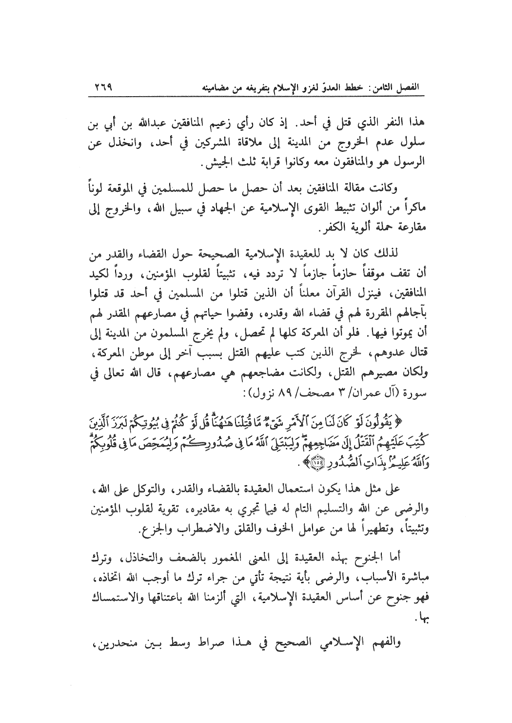 لذلك كان لا بد للعقيدة الإسلامية الصحيحة حول القضاء والقدر من أن تقف موقفاً حازماً جازماً لا تردد فيه، تثبيتاً لقلوب المؤمنين، ورداً لكيد المنافقين، فينزل القرآن معلناً أن الذين قتلوا من المسلمين في أحد قد قتلوا بآجالهم المقررة لهم في قضاء الله وقدره، وقضوا حياتهم في مصارعهم المقدر لهم أن يموتوا فيها. فلو أن المعركة كلها لم تحصل، ولم يخرج المسلمون من المدينة إلى قتال عدوهم، لخرج الذين كتب عليهم القتل بسبب آخر إلى موطن المعركة، ولكان مصيرهم القتل، ولكانت مضاجعهم هي مصارعهم، قال الله تعالى في سورة (آل عمران/3 مصحف/89 نزول) :