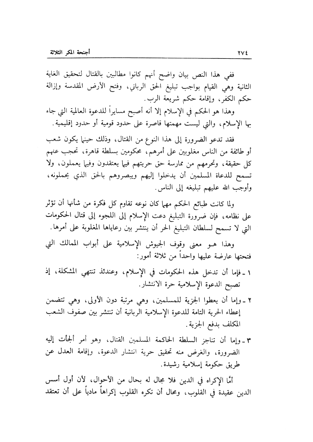 ولما كانت طبائع الحكم مهما كان نوعه تقاوم كل فكرة من شأنها أن تؤثر على نظامه، فإن ضرورة التبليغ دعت الإسلام إلى اللجوء إلى قتال الحكومات التي لا تسمح لسلطان التبليغ الحر أن ينتشر بين رعاياها المغلوبة على أمرها.