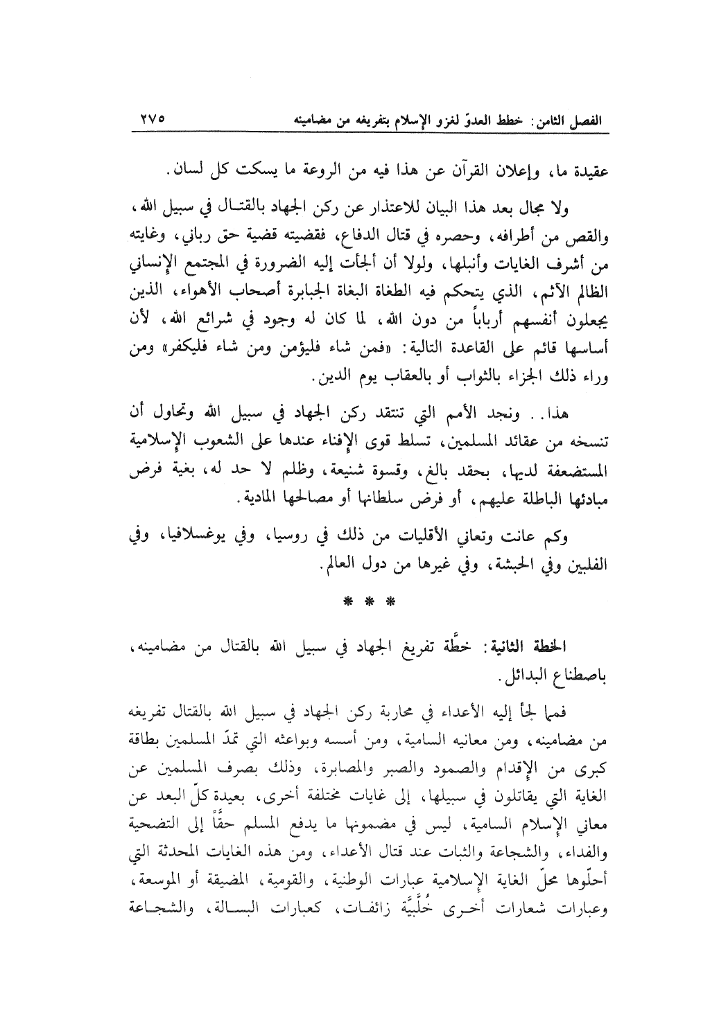 هذا.... ونجد الأمم التي تنتقد ركن الجهاد في سبيل الله وتحاول أن تنسخه من عقائد المسلمين، تسلط قوى الإفناء عندها على الشعوب الإسلامية المستضعفة لديها، بحقد بالغ، وقسوة شنيعة، وظلم لا حد له، بغية فرض مبادئها الباطلة عليها، أو فرض سلطانها أو مصالحها المادية.